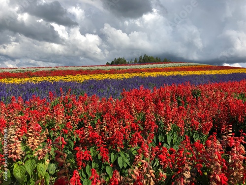 field, flower, poppy, landscape, nature, red, sky, spring, summer, meadow, green, tulip, blue, agriculture, farm, grass, rural, cloud, yellow, pigmentation, beauty, colourful