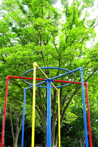 真夏の公園の遊具と欅風景