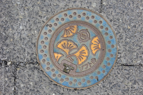 イチョウの葉がデザインされた、地面に設置された鉄製の蓋