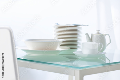 object, chair, rice, cup, clean, coffee, coffee cup, table, table setting, tee, teapot, dinner, desk, knife, fork, hotel, morning, eatery, chair, furniture, table, dish, stack, dish, meal, cleanliness, still life, morning, breakfast