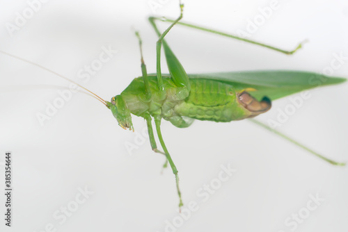 katydid, white background, insect, green, grasshopper, animal, isolated, macro, bug, nature, white, pest, antennae, up, leg, spring, invertebrate, jump, wildlife, leaf, wild, cricket