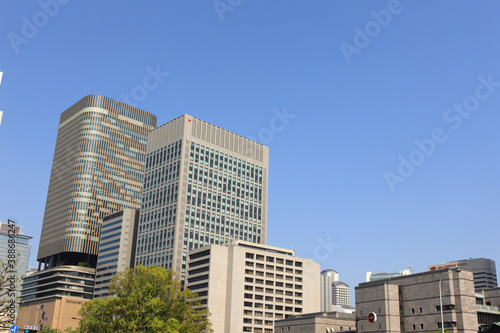 osaka, business district, business, highrise, building, blue skies, daytime, crossing, april, japan, city, city centre, building, sky