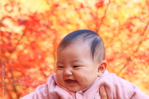 秋の紅葉と母親に抱っこされる赤ちゃん