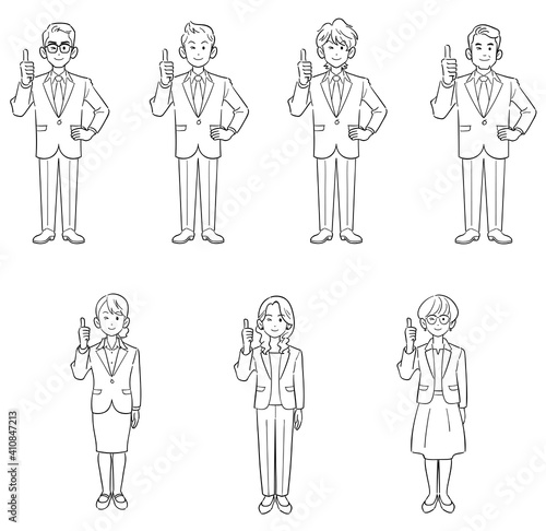 サムズアップするビジネスマンとビジネスウーマンの全身のイラストセット