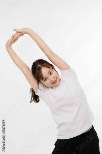 gymnastics, woman, health, health care, exercise, warmup, sport, arm, abs, muscle, t-shirt, young, indoor, room, relax, people, japanese, stretching, fitness, training, copy space, sweet, diet, exercise, smile, waist up, spat, leggings