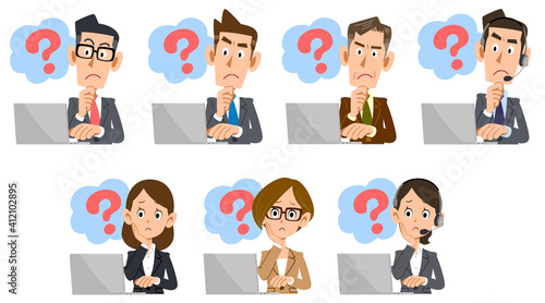 problem, apprehension, disapproval, trouble, business, personal computer, businessman, set, telecommuting, cyberspace, notebook, suit, corporation, office, boss, secondary, expression, puzzle, question mark, employee, variation, plural, flat, illustration, vector