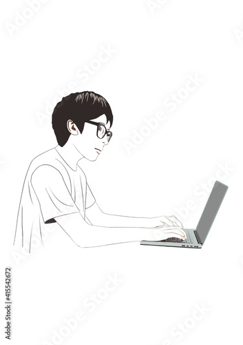 notebook, computer, business, young, noto, cyberspace, white, work, person, office, familiar, desk, man, waist up, indoor, japanese, t-shirt, glasses