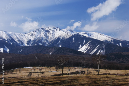 早春の山梨県北杜市 八ヶ岳牧場からの残雪の八ヶ岳