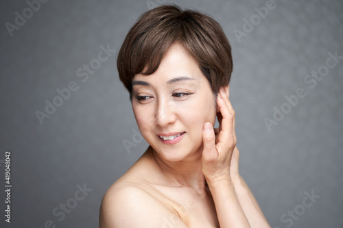 woman, japanese, cosmetic, beauty, cheek, skin, skincare, chinese, korean, waist up, asian, smile, 50's, middle-aged, model, face, beauty, clean, lovely, care, ageing, divert, tone, trouble, expression, contemplate