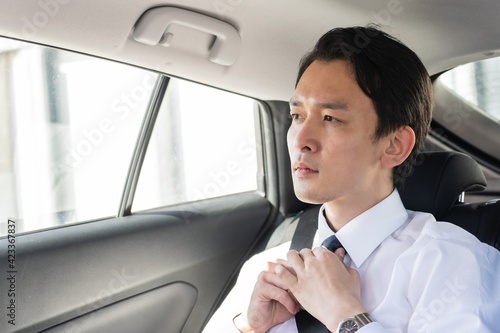 man, businessman, car, president, call, people, portrait, japanese, asian, alone, 30s, open air, work, work, business, salaried employee, employee, elite, high class, sophistication, smart, suit, car, vehicle, trip, business travel, busy, pressed for time, director, look, schedule, cravat
