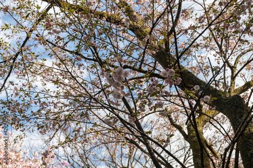 cherry blossom, bloom, wood, branch, sky, nature, spring, early spring, green, plant, leaf, park, april