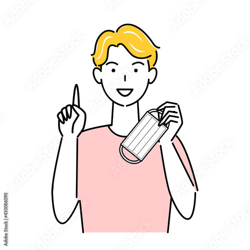 熱中症と肌荒れ予防対策のため外せるときにはマスクを外そう 指差しポーズに笑顔で提案している男性 イラスト シンプル ベクター