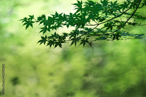 春の緑のモミジ(カエデ)と池の水面に映る緑のボケ