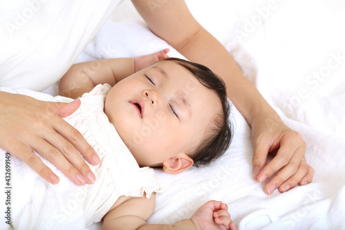baby, nap, go to bed, mother, mother, gentle, maternity, love, happy, protect, baby, newborn, children, toddler, young, small, mother, family, family, woman, woman, watch, happiness, happy, people, man, person, portrait, indoor, indoor, indoor, background, aerial, japanese, sheet, bed, hand, pat, tenderness