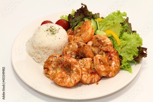 shrimp, shrimp, food, food, food, meal, side dish, dish, cooking, seafood, seafood, vegetable, vegetable, salad, lettuce, pepper, cucumber, cucumber, fries, stir fry, garlic, garlic, hawaiian, rice, rice, rice, tomatoes, cherry tomato, parsley, hood, dish, delicious