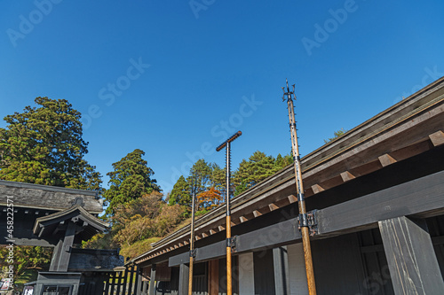 historic site, equipment, rail, view, landscape, japan, building, tourist attraction, history, lakeshore, nature, tour tourism, mountain, sky, showplace, travel, sunny, cloud, blue skies