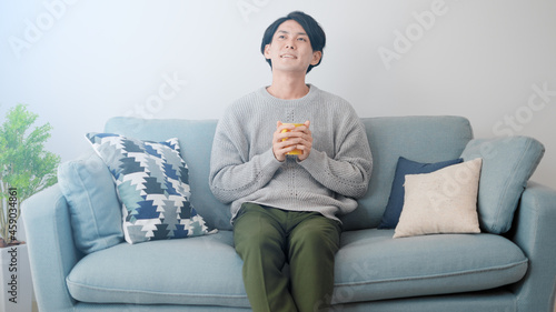 portrait, people, model, man, man, solo, alone, japanese, japan, asia, asian, black hair, young, youth, mug, cup, cup, drink, warm, hot, tea, coffee, warm up, winter, fall, cold, natural, indoor, house, home, room, couch, couch, cushion, drape, window, daytime, daytime, white background, copy space, space
