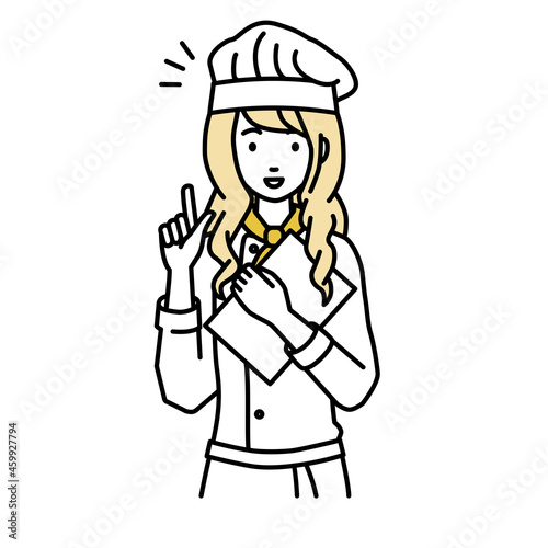white background, cut-out, illustration, vector, white, flat, business, flair, understanding, aware, point, hint, forefinger, document, board, work, work, people, woman, young, front, waist up, stood, yellow, chef, cook, cock, pastry chef, kitchen, kitchen, eatery, eatery, pastry, menu, hotel