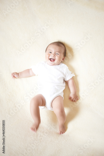 お布団の上で寝転ぶ笑顔の赤ちゃん