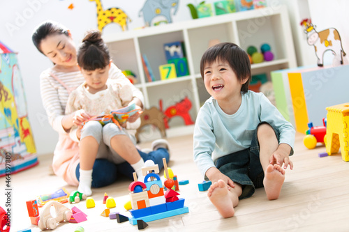 japanese, lifestyle, relax, indoor, sweet, picture book, fun, toy, seated, 30s, children, girl, woman, bed, smile, people, man, teacher, adult, boy, work, read, reading, preschool, nurse, embrace, book, innocent, friends, play, toddler