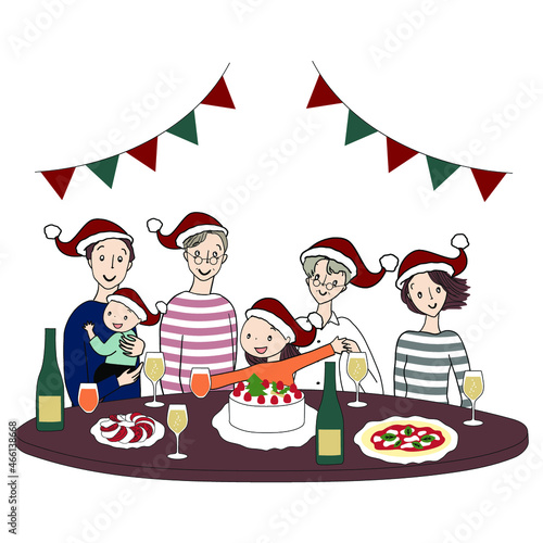 vector, christmas, aged, family, children, christmas eve, santa, girl, children, smile, illustration, fun, people, japanese, japan, baby, party, lively, winter, december, hat, grandparent, woman, man, chum, boy, waist up, deli, cake, garland, happy, celebration, ornament