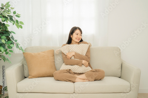 woman, couch, new life, joyful, fun, relax, pajama, couch, contemplate, pleasant, room, cosmetic, smile, vacation, home, condo, house, relax, seated, cushion, japanese, 30s, indoor, lifestyle, home, young, copy space, casual, beauty, natural, indoor, drape, houseplant, asian, smile, front, people