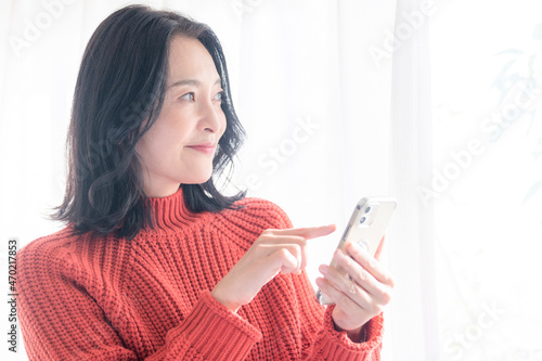 woman, smartphone, app, call, mobile phone, homemaker, mother, mother, work, seek, select, byte, smile, relax, backlighting, light, encounter, affirmation, 30s, 50's, reservation, order, ec, copy space, look, lovely, happy, portrait, smiling, morning, winter, fall, knit, lifestyle, smile, light, white, room, zoom, closeup, asian