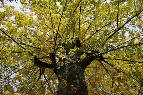 fall, wood, fall, nature, forest, yellow, leaf, sky, branch, season, green, foliage, blue, gold, park, pigmentation, trunk, plant, landscape, birch, acer