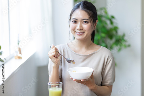朝食を食べる女性