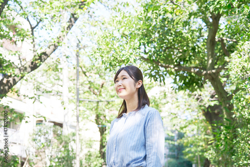 open air, woman, smile, portrait, verdure, young, refreshing, outside, japanese, relax, park, smile, smile, background, asian, waist up, alone, 30s, people, nature