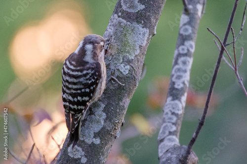 赤と緑の美しい背景の中にいるコゲラ