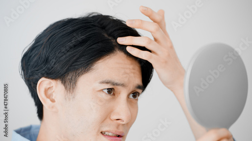 portrait, model, person, people, man, man, young, japanese, japan, asia, black hair, alone, solo, cosmetic, beauty, hair care, care, hair, hair, bald, epilation, fall out, mirror, hand mirror, looking-glass, check, contemplate, sad, negative, indoor, natural, copy space, white background
