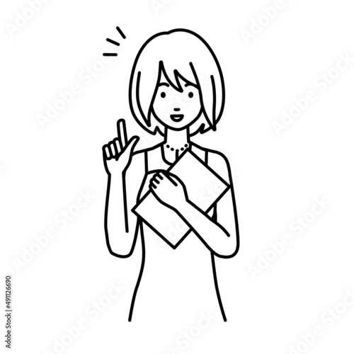 point, hint, flair, business, aware, idea, work, ol, employee, dress, understanding, white background, cut-out, illustration, vector, flat, forefinger, document, board, work, people, woman, 30s, front, waist up, stood, smile, career woman, carrier, necklace, get-together, red, black-and-white