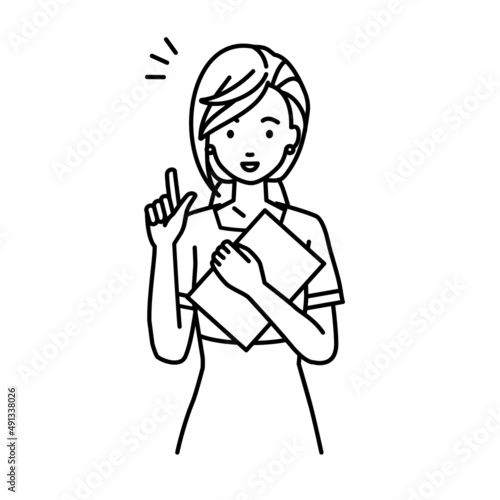 point, hint, flair, business, aware, idea, work, este, uniform, reception, understanding, white background, cut-out, illustration, vector, flat, forefinger, document, board, work, people, woman, 30s, front, waist up, stood, smile, health spa, relaxation, massage, sarong, cosmetic, reception, occupation, black-and-white, customer service
