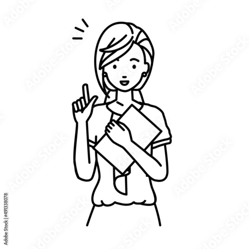 point, hint, flair, business, aware, idea, work, ol, employee, understanding, white background, cut-out, illustration, vector, flat, forefinger, document, board, work, people, woman, 30s, front, waist up, stood, smile, career woman, carrier, waist, chiffon, advisory, skirt, boss, colleague, black-and-white
