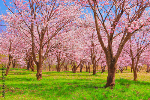 plant, flower, wood, cherry blossom, sakura, sakura, full bloom, flower petals, nature, landscape, spring, april, sky, blue skies, sunny, background, textured, copy space, poster, pamphlet, view, open air, outdoors, hanami, pink, green, blue, light, lovely, clean, japan