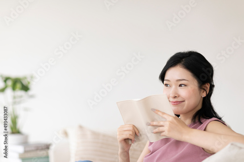 japanese, couch, portrait, lifestyle, living room, relax, indoor, relax, seated, home, woman, novel, smile, waist up, people, read, reading, room, book, asian
