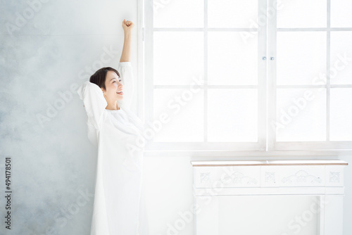 growth, stretching, flexible, smile, woman, people, japanese, asian, 30s, middle-aged, young, homemaker, casual, natural, break, relax, relax, loosen up, refresh, rest, refreshing, shortcut, short hair, stretch, gymnastics, exercise, cosmetic, beauty, health care, health, window, morning, house, white, cleanliness
