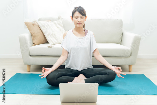 personal computer, cyberspace, yoga, motion picture, muscle, training, online, gymnastics, woman, exercise, notebook, lesson, diet, fitness, exercise, smile, sport, beauty, stretching, contemplation, pursuit, cosmetic, gym, room, health, beauty, house, middle-aged, 50's, seated, asian, japanese, people