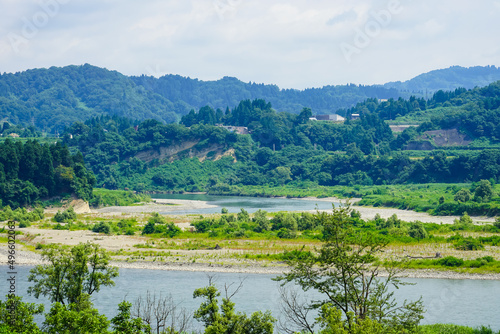 river, stream, meandering, grass, cliff, water surface, flow, basin, bridge, way, japan, landscape, sunny, tour tourism, tourist attraction, visitor, leisure, travel, pretty, calm, relax, material, grove, forest, mountain, green, open air