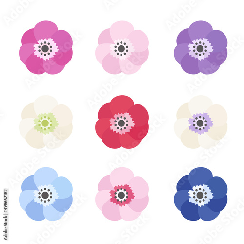 anemone, flower, illustration, set, vector, icon, material, variation, sweet, flower petals, illustration, decoration, ornament, front, kind, wedding, garden, natural, gardening, florist, plant, nature, red, pink, purple, purple, sky blue, blue, white, flat, design, image, graphic, symbol, plural, white background, spring, winter
