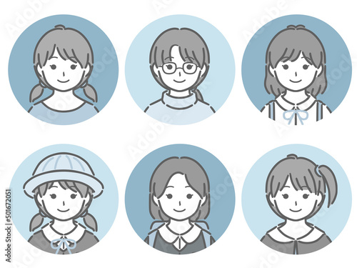 woman, woman, girl, student, toddler, children, young, young, uniform, schoolbag, school, smile, waist up, front, blue, constraint, icon, circle, set