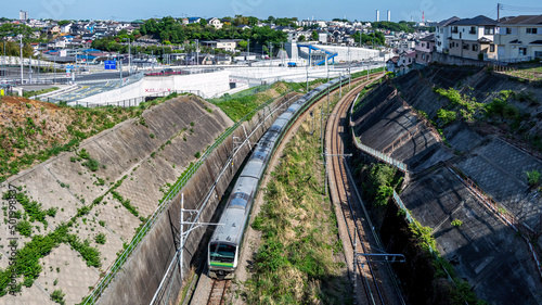 train, suburban, green, rail, transportation, traffic, aerial, car, rail, high speed, route, train, city, highway, travel, landscape, aerial, sky, view, station, transport, building, urban, rail, expressway, mountain, street, architecture, stream, way, city landscape
