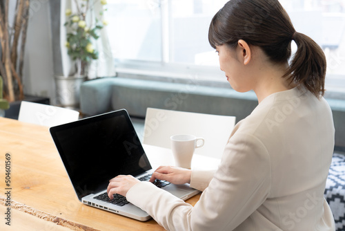 business, notebook, personal computer, woman, people, japanese, work, young, 30s, indoor, waist up, indoor, table, lifestyle, office, contemplate, asian, cyberspace, ol, room, copy space, smile, personal computer, seated, career woman, homemaker, tablet, telecommuting, remote, suit, boardroom, office, home, faithful, earnest, pretty, sweet, white, solemn