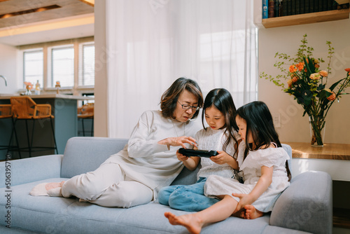 woman, children, grandchild, game, family, grandparent, relax, people, smile, couch, fun, happy, peace, love, room, lifestyle, house, indoor, drape, flower, aged, chum, daytime, glasses, black hair