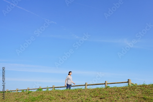 bank, rail, blue skies, woman, walking, jog, open air, outdoors, light, t-shirt, health, healthy, health care, japanese, summer, field, landscape, green