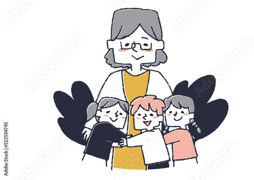 女性教師に信頼を寄せる小さな生徒たち 愛情を持って教育に携わる教員、スタッフのイラスト