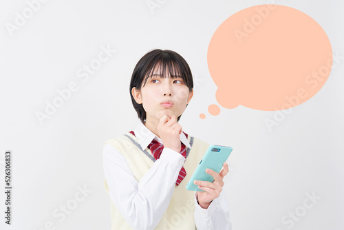 uniform, woman, smartphone, contemplate, spend, white background, possess, smartphone, japanese, unrest, apprehension, hesitate, trouble, alarmed, depression, vest, ribbon, shirt, asian, teenage, alone, serif