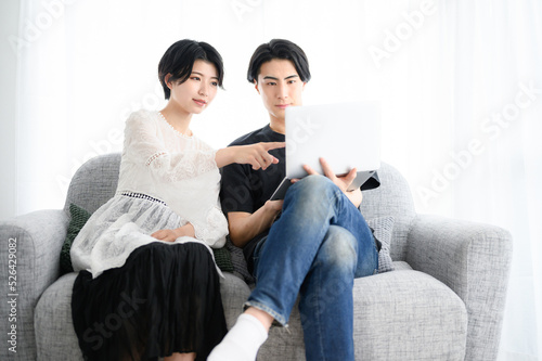 couple, couple, honeymooners, couch, personal computer, lover, search, seek, examine, cyberspace, seated, backlighting, move, rental, man, woman, japanese, asian, portrait, lifestyle, people, 30s, two people, relax, relax, family, room, copy space, couch, chum, light, fun, casual, young, happy, future, hope, house, cohabitation, waist up