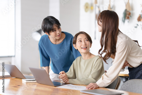 business, businessman, woman, career woman, work, work, office, designer, personal computer, notebook, team, group, plural, corporation, people, japanese, asian, 30s, indoor, consultation, speaking, conversation, mail, advisory, desk, smile, agenda, management, teamwork, venture, engineer, feedback, meeting, meeting, brest, freelance
